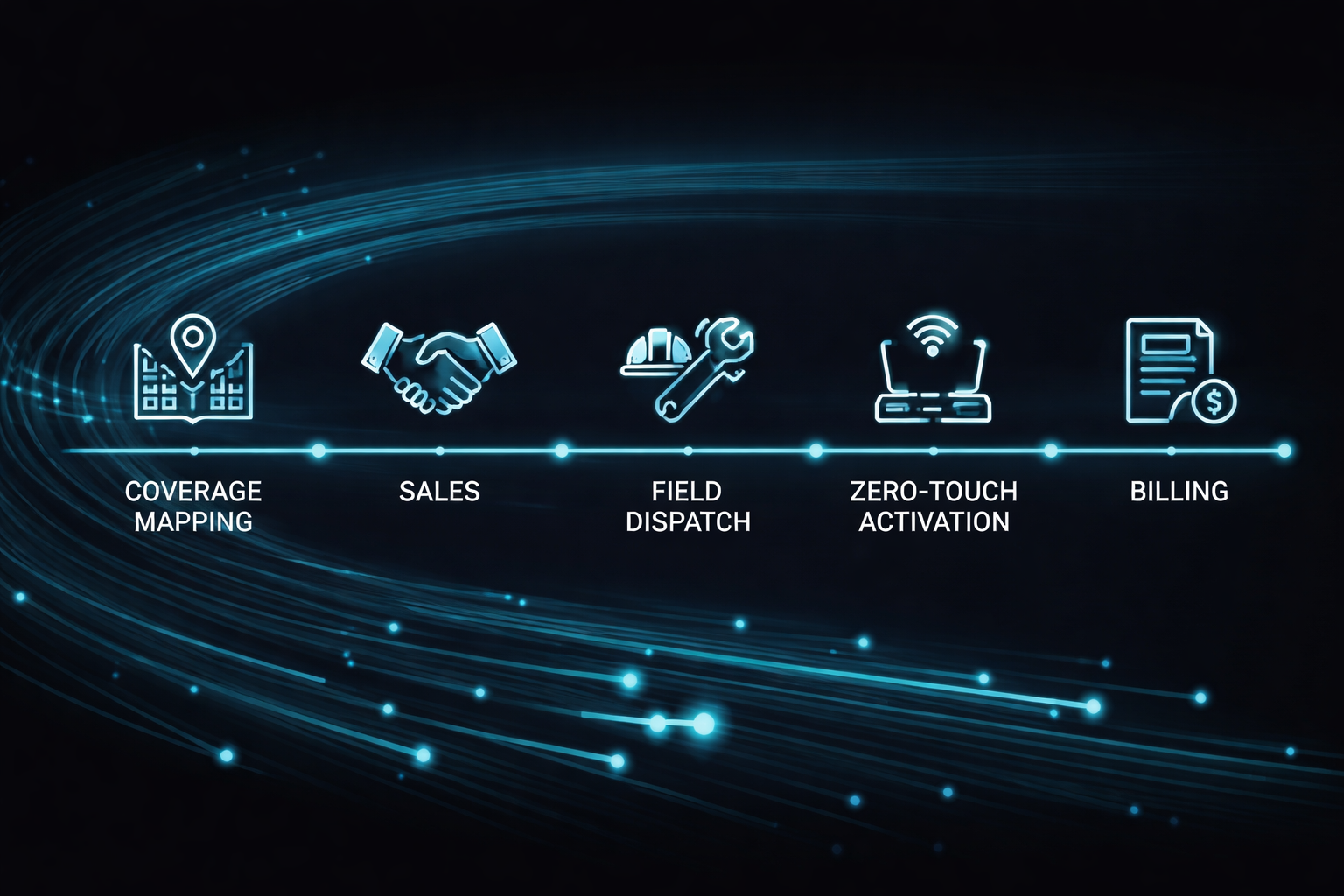 An automated OSS/BSS platform combines both layers into a single system where data flows continuously from coverage planning through sales, installation, activation, billing, and retention. Zero-touch refers specifically to the activation piece: when a technician completes an install in the field, the service provisions and the billing clock starts automatically, with no back-office intervention required.